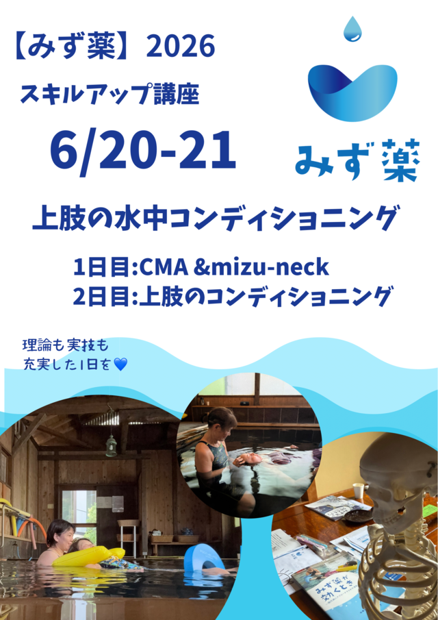 【修了生の方】のお申し込みサイトです。 第4回スキルアップ講座 2026/2/14(土) ・CMA(Complex Movement in Aqua)の活用法 ・【mizu-neck】(頸椎ほぐし) *【mizu-neck】の技術を習得された方には、認定証を授与致します。 【みず薬】を体験したい方や下肢のコンディショニングを更に詳しく学びたい方におすすめの講座です。 この講座では、専門の講師による実践的な指導のもと、さらに、【みず薬】を取り入れた水中コンディショニングが学べる貴重な機会です。 ぜひこの機会に、【CMA】・【mizu-neck】について学び、お客様だけでなく。ご自身の健康やパフォーマンス向上に役立ててください。 ※事前の予約が必要となりますので、お早めにお申し込みください。 ※昼食はご持参ください。(近くにコンビニがあります) ※料金には、指導料・入湯料が含まれています。